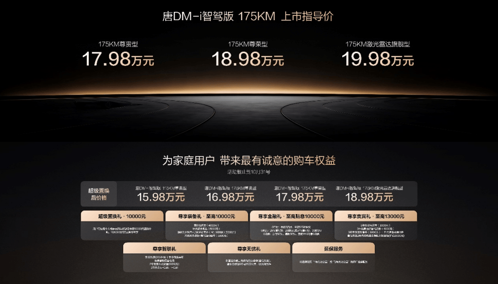 在家用SUV市場,比亞迪唐系列早就是國民級選手,十年賣了83萬輛,不是靠噱頭,而是真的懂中國家庭要什么。2025年9月16日,唐DM-i智駕版175KM長續航版正式上市,3款車型指導價17.98萬-19.98萬,10月31日前購車還能享1萬置換補貼,置換補貼后16.98萬起,另外還能疊加至高4.3萬的盛唐禮遇。這不是簡單的加配不加價,而是把家用全能拆成了一個個能落地的日常場景,從接娃放學的瑣碎到全家自駕的浪漫,每一處設計都踩在家庭用戶的需求點上。
