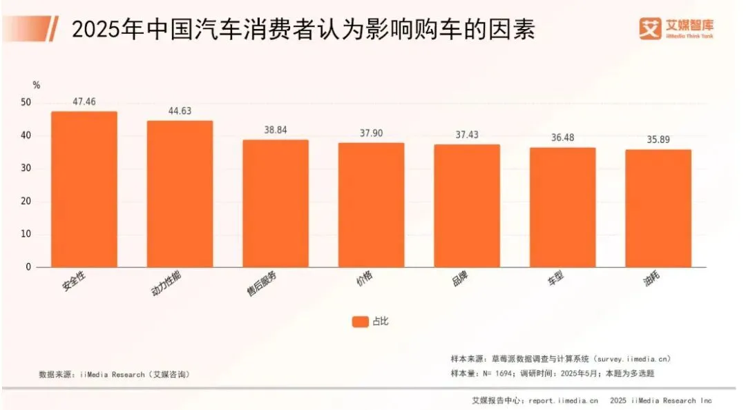 安全性能與動力性能是用戶的首要需求。據調研機構艾媒咨詢數據,2025年中國汽車消費者購車的影響因素中,47.46%的安全性和44.63%的動力性能排在第一、二位。