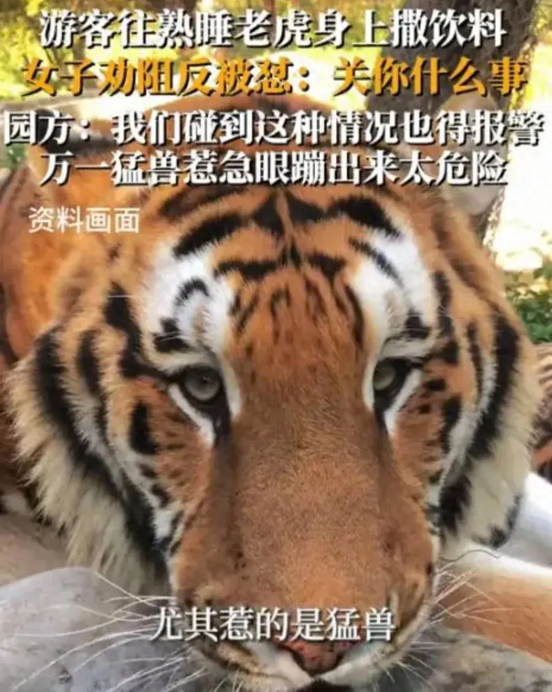 只見一位女游客手持飲料,對著正在悠閑休息的老虎就是一通“潑”。老虎大哥被這突如其來的“冷水浴”嚇得一愣一愣的,估計內心OS是:“老鐵,你啥情況?我惹到你了?”