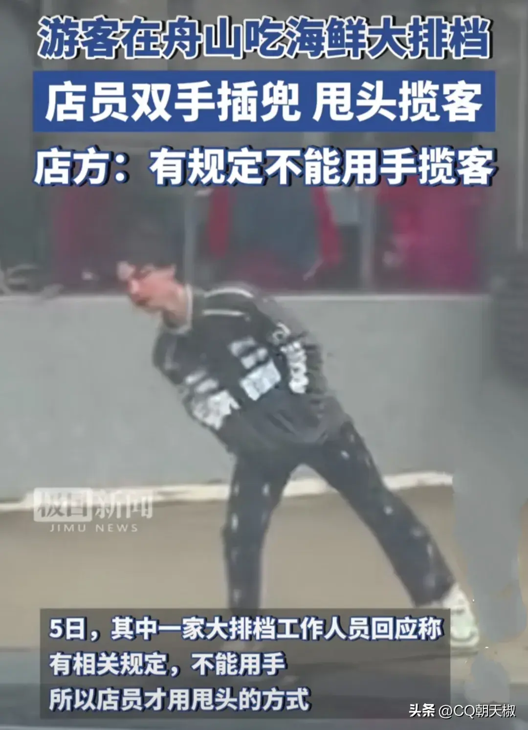 只見他們雙手插在兜里,或者把手放在背后,使勁甩頭給顧客示意,停車到自家店門口用餐。