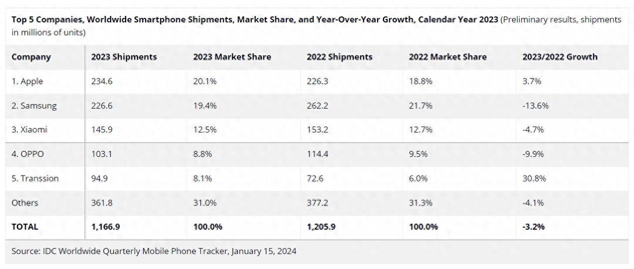 對(duì)于蘋果來說,2023年可能是最好的一年。這一年全球市場(chǎng)中,蘋果出貨量高達(dá)2.346億部,首次超越三星拿下全球出貨量第一的寶座。同時(shí),根據(jù)各大調(diào)研機(jī)構(gòu)的數(shù)據(jù)來看,在國(guó)內(nèi)手機(jī)市場(chǎng)中,蘋果出貨量也是排名第一的。