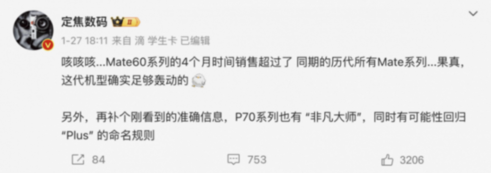 截至目前,華為Mate60系列開售已經(jīng)4個(gè)月左右的時(shí)間了,估計(jì)很多人好奇Mate60系列的銷量是多少。雖然官方并未公布具體數(shù)據(jù),但根據(jù)博主的爆料來看,華為Mate60系列4個(gè)月的銷量,超過了同期的歷代所有Mate系列,其中就包括一代神機(jī)Mate40系列,這么來算的話,估計(jì)華為Mate60系列至今的銷量達(dá)到了千萬(wàn)級(jí)。更別說在接下來的3月份,還有華為P70系列這款重磅旗艦了。