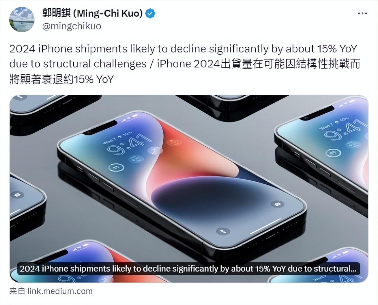 據(jù)知名外媒爆料稱,蘋果公司已下調(diào)上游關(guān)鍵半導(dǎo)體零組件的2024年iPhone出貨預(yù)估至約2億部,同比衰退15%。也就是說蘋果為了預(yù)防未知的風(fēng)險(xiǎn),提前縮減了規(guī)模,2024年出貨量可能會(huì)出現(xiàn)15%左右的下降幅度。
