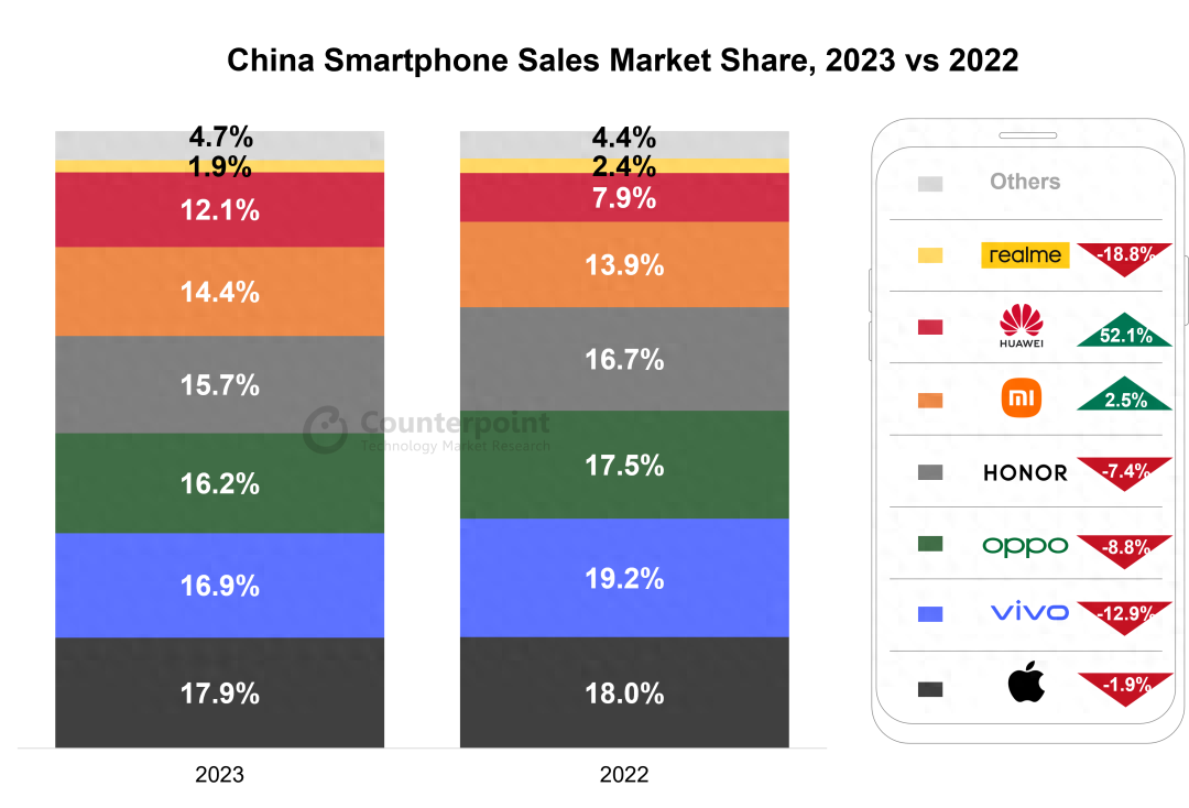 回顧前幾年,盡管手機市場總體呈現低迷趨勢,但是各大廠商依舊內卷不斷,折疊屏手機、衛星通信技術、AI手機大模型等等新技術,廠商們紛紛開創內卷新賽道。而從前幾日各大調研平臺如IDC、Counterpoint、Canalys等公布的2023年中國市場智能手機出貨量排名來看,目前的國內手機市場可用“一超多強”的局勢來形容,蘋果依舊穩居國內第一,而其他國內廠商也以5%以內的差距緊隨其后。