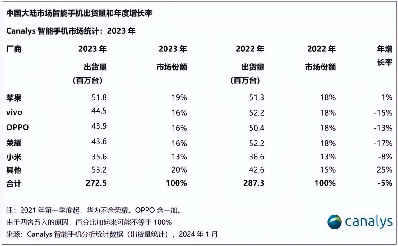再轉回國內,如果不看蘋果,國內各大廠商的表現也值得肯定!要說縱觀全年數據最亮眼的,那OPPO絕對算的上一位,雖說2023年國內智能手機市場規模有所下降,但OPPO表現依舊穩健,根據Canalys的公布數據來看,2023年OPPO依舊能以4390萬臺的出貨量和16%的市場份額排進國內前三的好成績。