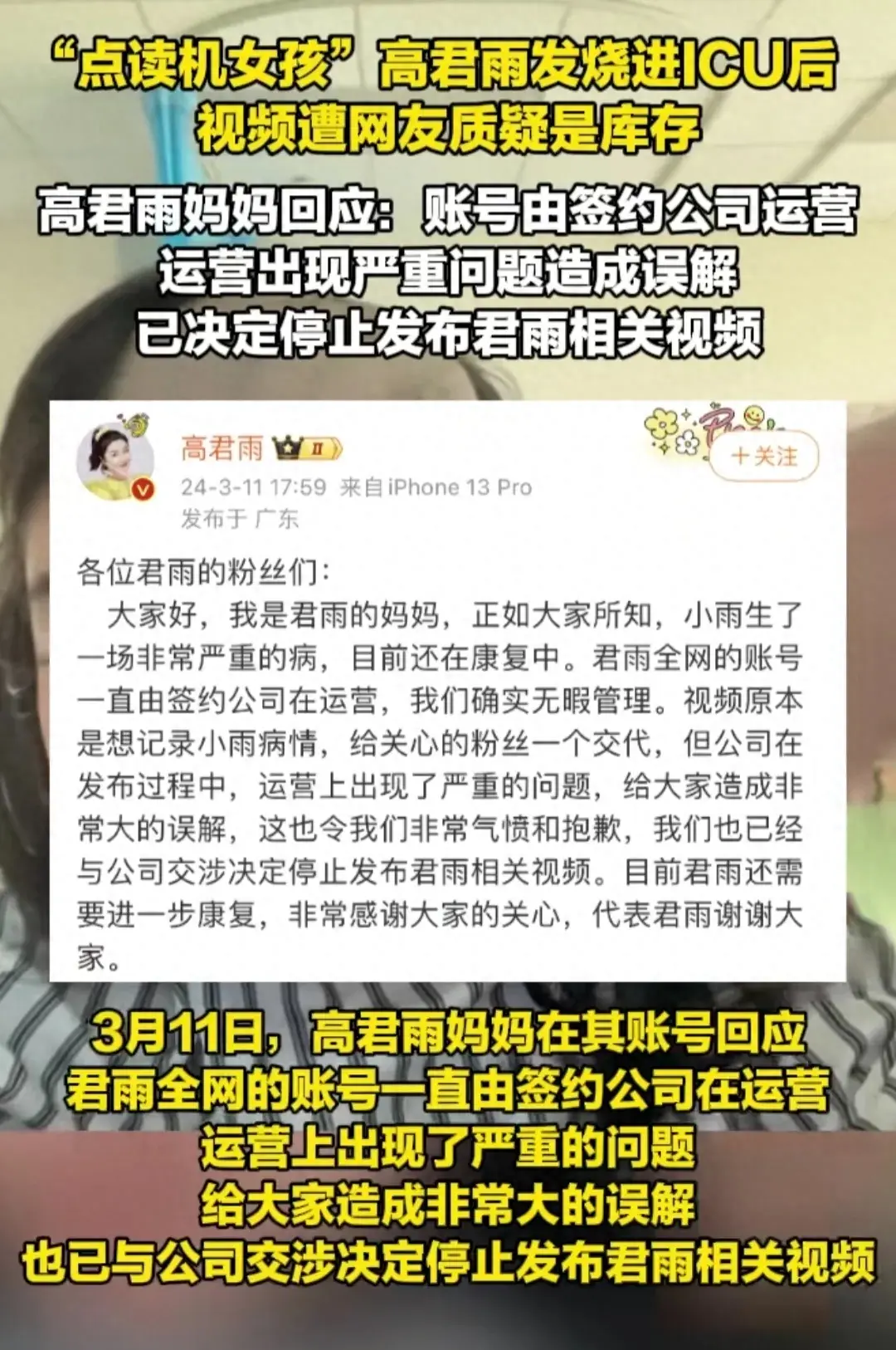 一時之間,網絡風評集體倒向,本來關心高君雨病情的網友們都感覺自己被騙了,紛紛指責高君雨欺騙大家。真相曝光后,高君雨媽媽趕緊出來道歉,首先說明高君雨確實是很早之前做過手術了,只是高君雨的全網賬號都是由MCN機構運營的,自己對此一無所知,也感到十分氣憤。