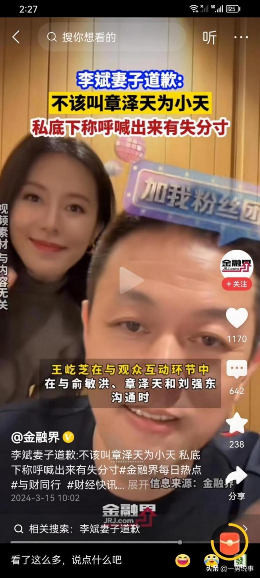近日,李斌和妻子王屹芝開直播時,王屹芝對2017年公開喊章澤天為小天的一事而道歉。