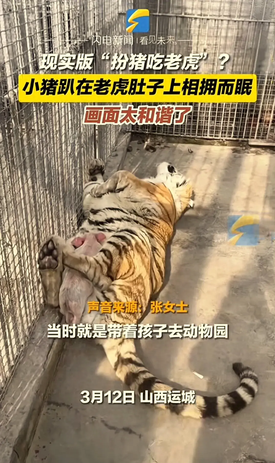 山西運城某動物園出現了令人嘖嘖稱奇的一幕,一只小豬居然悠哉悠哉地趴在老虎的懷里一起相擁而眠,難道小豬不怕老虎吃掉自己嗎?而老虎似乎也沒有吃掉小豬的打算。還有哦,老虎的籠子里放一只小豬,應該不是給老虎吃的,不然就太殘忍了,那一定是讓小豬和老虎在一起玩鬧的。