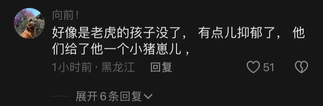 好像是老虎的孩子沒了, 有點兒抑郁了, 他們給了他一個小豬崽兒 ,