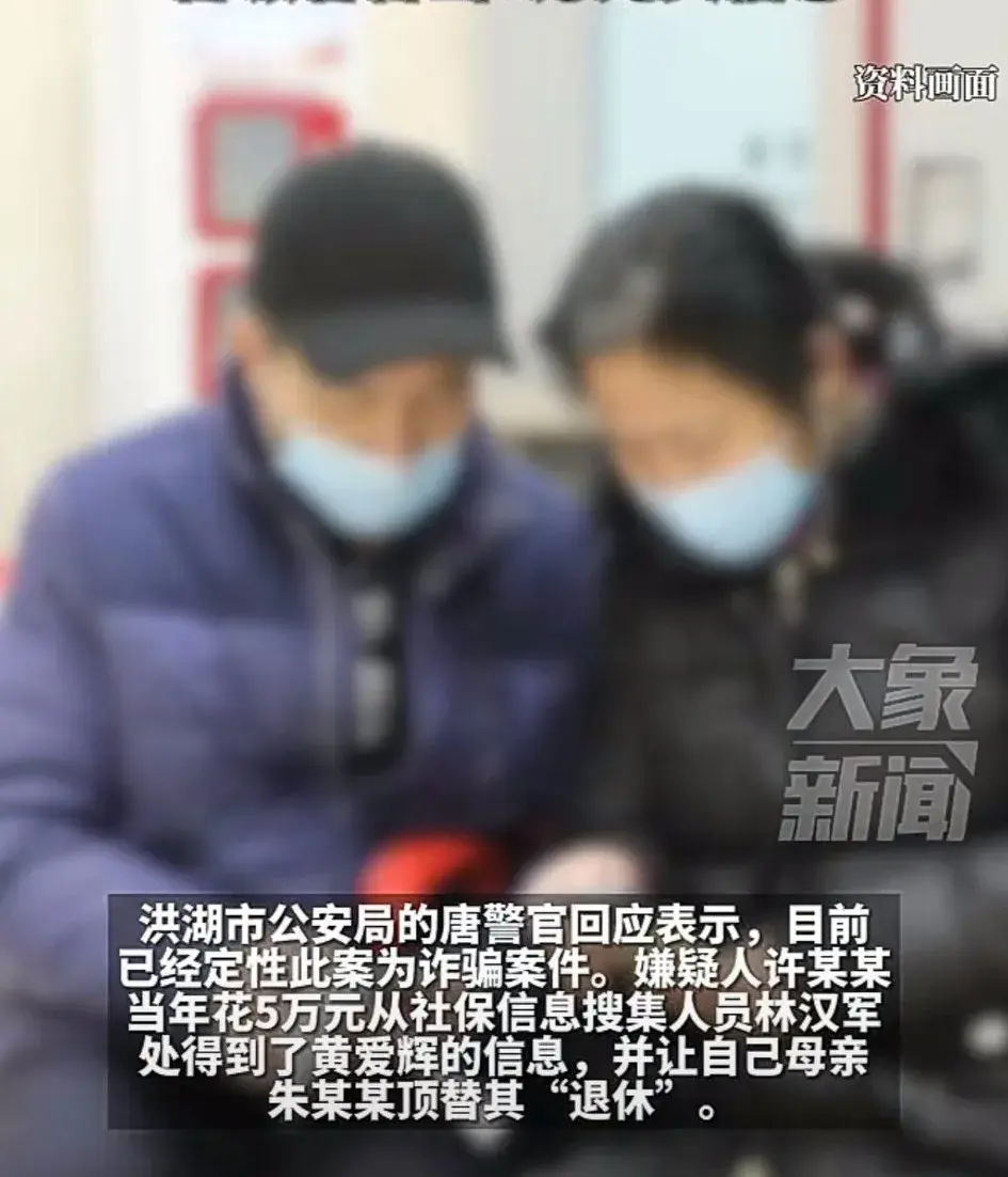 據公安部門調查,是一個姓許的,花5萬元從社保信息收集員處得到黃女士信息,并讓自己的母親朱某某頂替其“退休”。