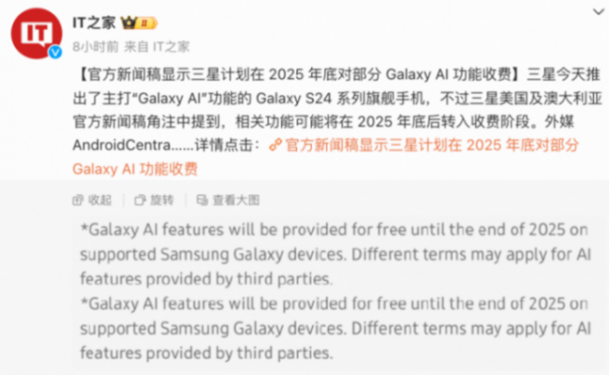 不過,來自IT之家的一份報道顯示:三星主打 Galaxy AI 功能的 Galaxy S24 系列旗艦手機,相關(guān)功能可能會在 2025 年底后轉(zhuǎn)入收費階段。