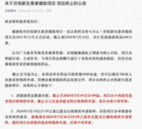 然而,今年三月,一個意外的消息打破了他們的平靜。項目方突然宣布,由于藥物庫存告急,贈藥活動不得不中止。這對于已經投入巨額資金的患者來說,無異于晴天霹靂。這個‘沃悅新生’援助項目的停止,其實早有跡象。去年7月,他們就不讓新的患者加入了;到了10月和11月,項目方連發兩次通知說藥品庫存不夠了。到了今年年初,患者去領藥的時候發現,審批材料的時間拉長了,領藥程序也復雜了不少。最后,這項目還是撐不下去了。
