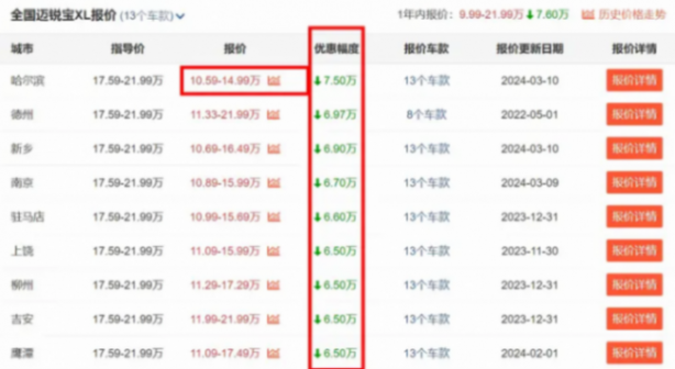 邁銳寶XL原本售價17.59-21.99萬,大多時候在市場中都保持著4-5萬的優惠,但是最近網上有消息稱這臺車在部分地區的現金優惠最高已經達到了7.5萬。其中1.5T的邁銳寶XL車型擁有7萬的最高優惠幅度,而2.0T車型則擁有最高7.5萬元的降價,可以說是空前的優惠力度了。也就是說,它的入門級車型裸車價已經來到了10.59萬,落地也就十萬出頭,即便是頂配車型裸車也不到15萬了,絕對稱得上是“價格屠夫”。