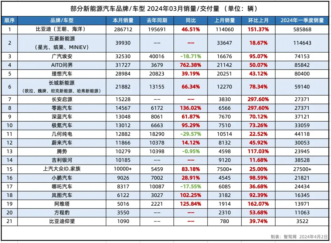 從特斯拉的市場表現,我們再來看2024年3月和一季度新能源的銷量數據。會有一種更宏觀的視角。