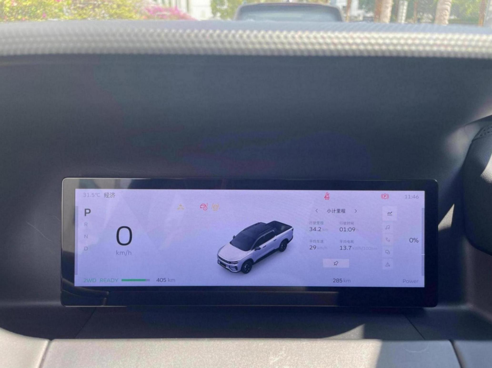 雷達地平線搭載高性能雙電驅系統,峰值總功率315kW,峰值總扭矩594N·m,最高車速為190km/h。公路行駛過程中,它的動力很足,畢竟是純電車型,其NVH是一個優勢。它不會像傳統燃油皮卡那般會有發動機的噪音,無論是前排后排都能處于一個比較安靜的空間。當然,另一方面,也是雷達地平線有對這臺車做了一個較好的降噪處理,比如搭載了前后擋雙層5mm隔音PVB膜以及電機“傘頻”主動降噪技術等。