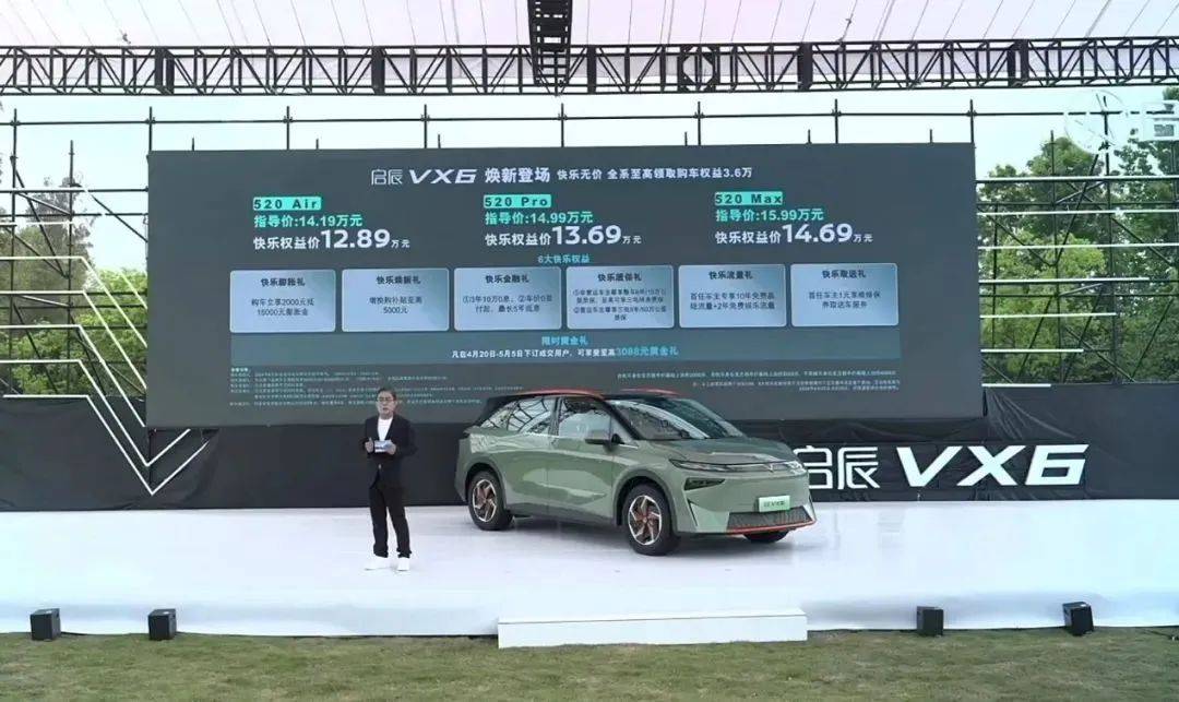 新款啟辰VX6推出了520 Air、520 Pro、520 Max三款車型,指導價14.19-15.99萬元,權益價在此基礎上下調13000元。官方還推出“6大歡樂權益”和“限時黃金禮”,進一步降低購車門檻。新車外觀沒有變化,依舊采用鮮明的新能源設計語言。新增一款“不焦綠”配色,采取諧音的同時更增添年輕氣息。車身尺寸為4658*1890*1656mm,軸距2850mm,乘坐空間較舒適。