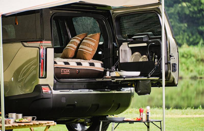 作為一臺百變房車,極石01搭載了業界首創的車載尾門廚房系統自帶照明操作臺,220V供電、直飲熱水、操作臺、儲物收納等一應俱全,美食創意隨心發揮。7座車型可以快速放倒二、三排座椅,配合定制床墊變成一張2米×1.3米的全平大床。支起車邊帳,13平米戶外客廳勾勒出的無限可能,也在天地之間徐徐展開。